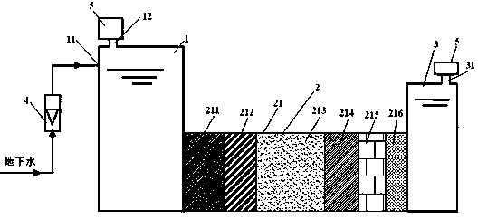 為解決上述問題,本發明的目的在于提供一種用于地下水處理的可滲透反應墻裝置,克服現有技術綜合處理效率低的缺陷,提供一種成本低、綜合處理效率高、單位體積可處理污水量大的可滲透反應墻裝置。